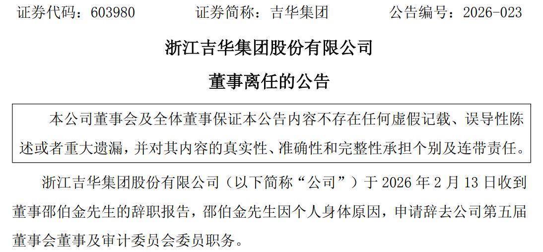 吉华集团(603980)日前发布公告,公司实控人邵伯金因个人身体原因,申请辞去公司董事及审计委员会委员职务。