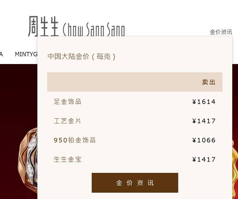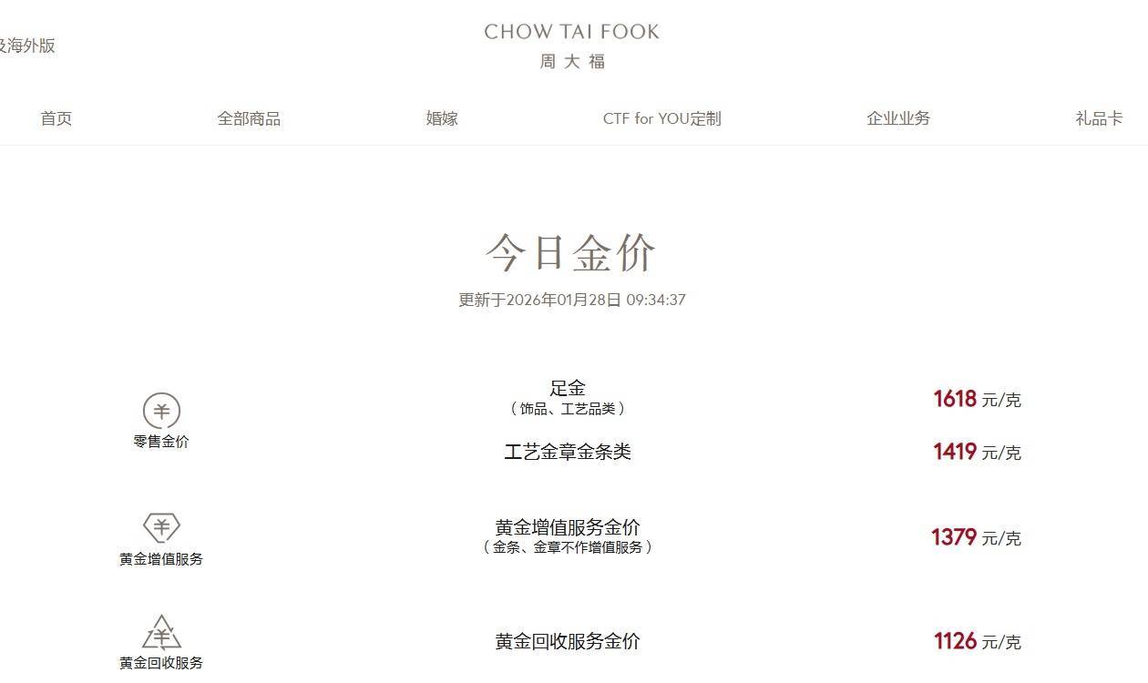 其中,周生生报价1614元/克,较前一日涨37元;周大福报价1618元/克,较前一日涨40元;老凤祥报价1620元/克,较前一日涨44元;老庙黄金报价1612元/克,较前一日涨37元。